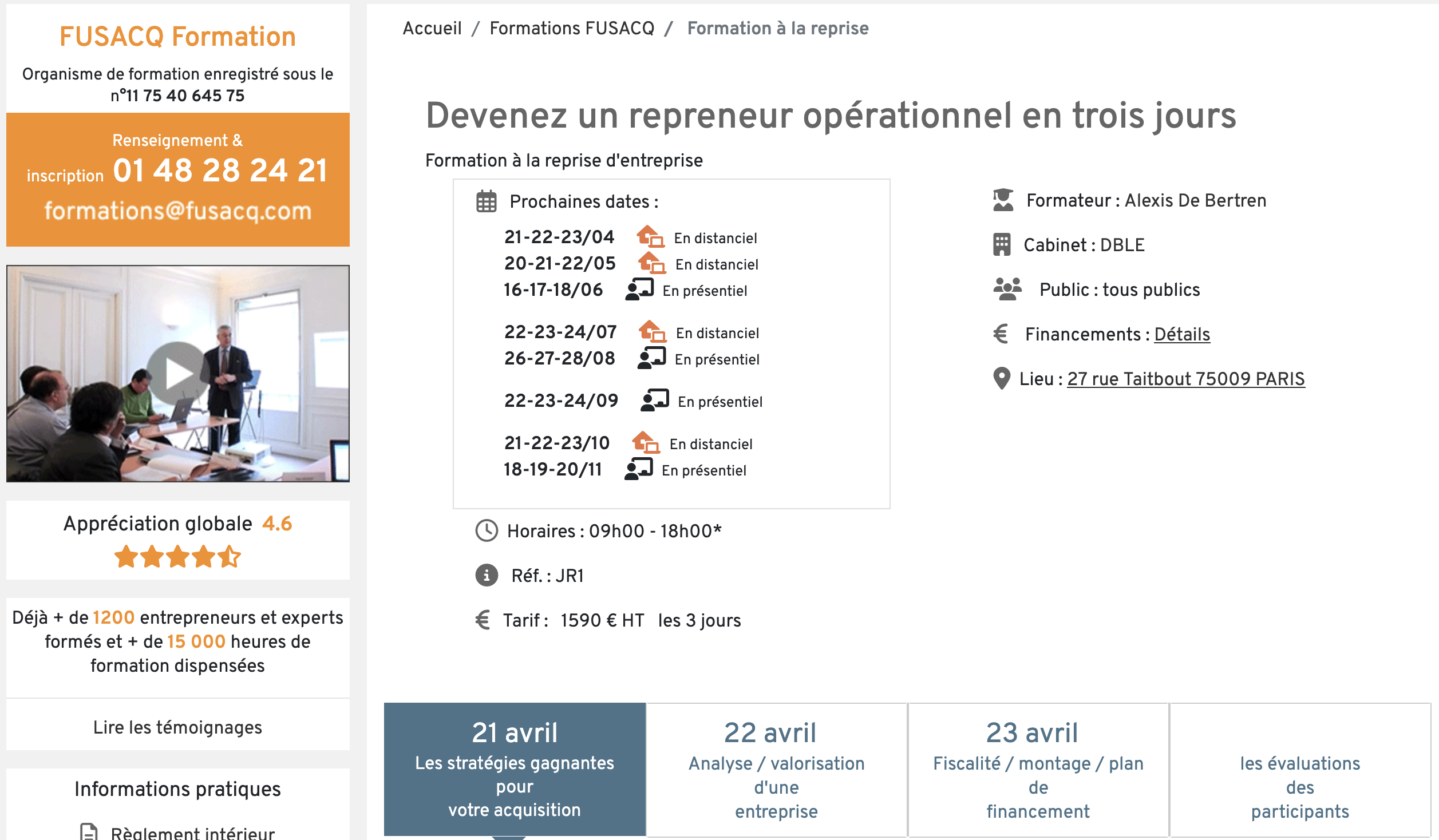 Pour qui : les repreneurs qui veulent une formation structurée et complète, avec un engagement de trois semaines à temps plein. Recommandé à ceux qui ont un projet sérieux mais pas encore de cible identifiée.