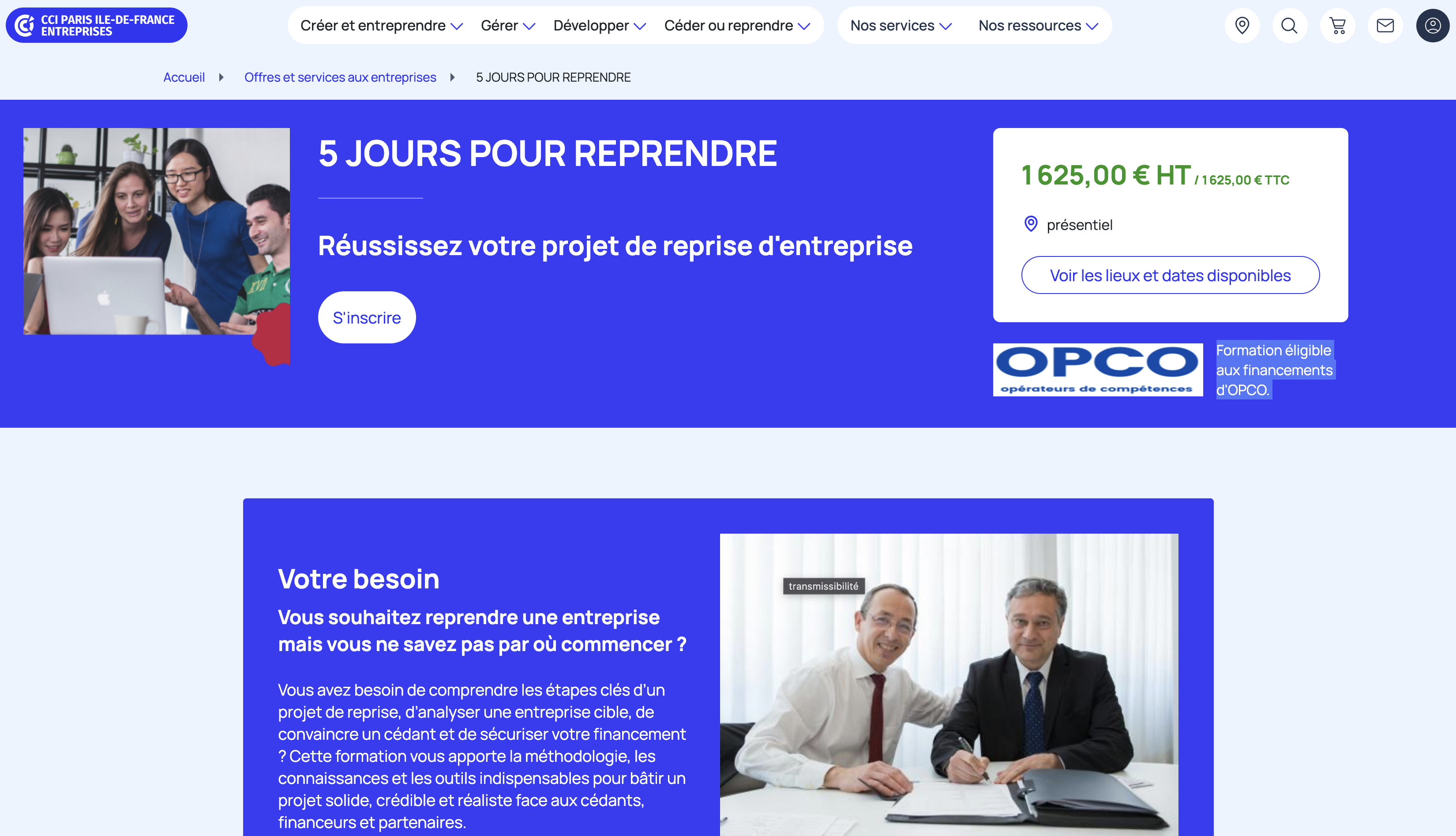 La CCI Paris Île-de-France propose un programme de cinq jours en présentiel, complet et structuré, à un tarif parmi les plus compétitifs du marché : 1 625 € HT pour 35 heures de formation. Le programme couvre l'ensemble du parcours de reprise, de la définition du projet jusqu'à la concrétisation, avec des intervenants experts en évaluation, finance, droit et stratégie.