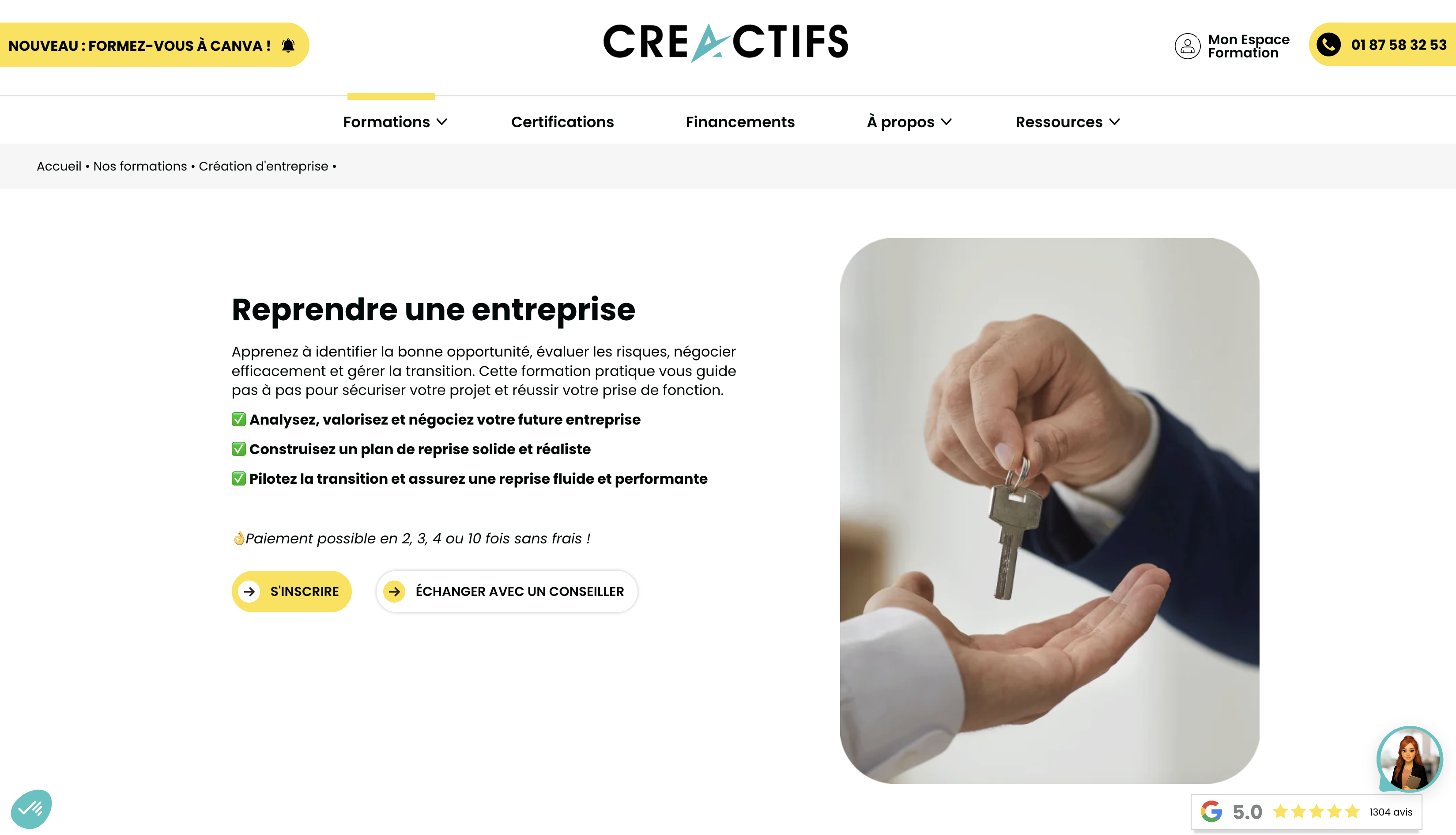 L'organisme affiche 5 000 entrepreneurs accompagnés en dix ans et une note de 5/5 sur 1 315 avis Google, un volume d'avis significatif qui renforce la crédibilité de la notation. Le prix de 2 400 € TTC peut être réglé en deux, trois, quatre ou dix fois sans frais.