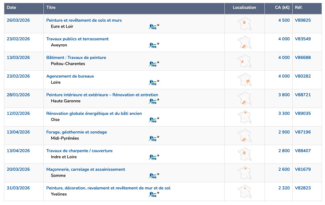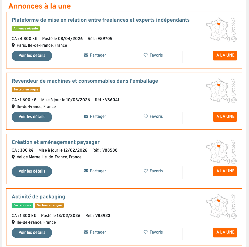 🎯 Notre avis : idéal pour un primo-repreneur qui cherche un accompagnement humain de qualité. Le volume d'annonces est faible, mais la sélection et le sérieux des dossiers sont au rendez-vous.