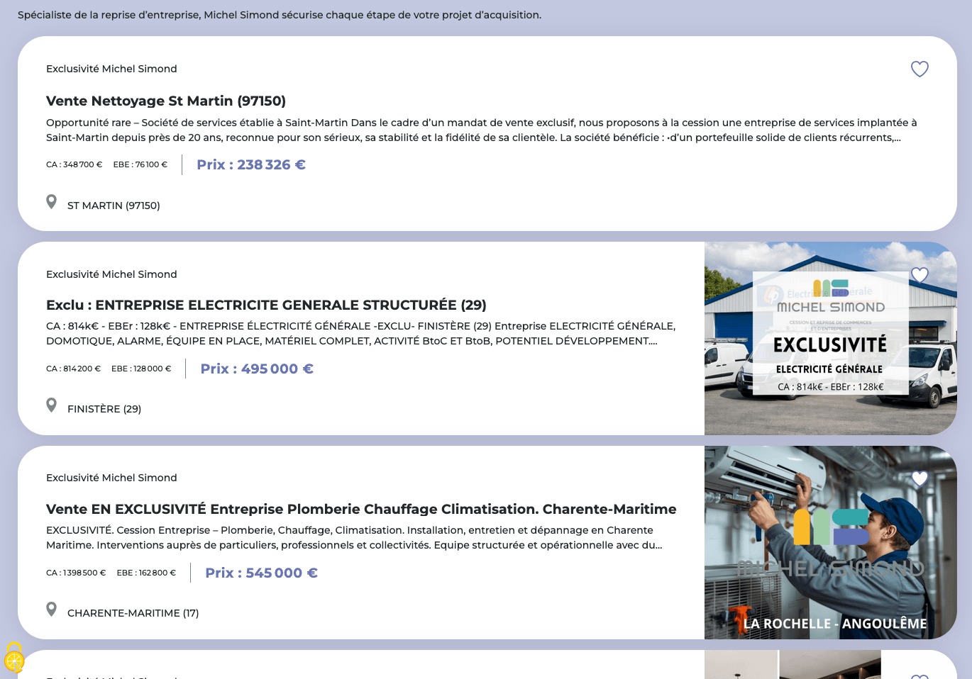 Michel Simond est un cabinet d'affaires présent sur l'ensemble du territoire avec 300 consultants. Sa plateforme couvre quatre secteurs : commerce, hôtellerie, entreprises/PME et immobilier commercial. La section dédiée aux entreprises et PME propose 736 annonces exclusivement dans cette catégorie.